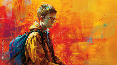 Fototapeta premium A vibrant digital painting presents a boy with a backpack sitting on a bench, creating an expressive artwork.