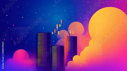 Fototapeta premium A vibrant digital skyline with colorful clouds and abstract data visuals, representing growth.