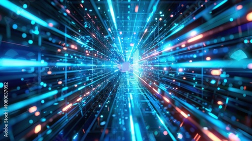 Fototapeta premium A vibrant digital tunnel of blue and orange light beams, suggesting movement through cyberspace.