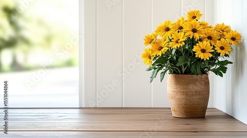 Fototapeta premium A vibrant display of cheerful yellow flowers in a rustic pot on a wooden table, symbolizing joy, positivity, and the beauty of nature indoors and outdoor spaces.