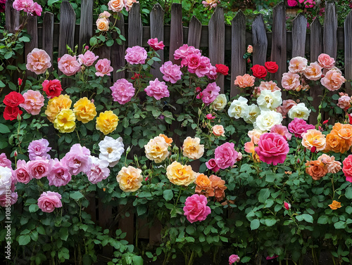 © Bayu, Obraz premium A vibrant display of colorful roses blooming against a wooden fence.