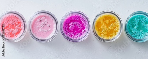 © Wimon, Naklejka premium A vibrant display of colorful scrubs in glass jars, showcasing pink, purple, yellow, and blue hues, perfect for skincare enthusiasts.