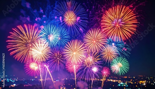 © Nuii Nayeon Nuni Kno, Naklejka premium A vibrant display of fireworks lights up the night sky, with a background of distant city lights, creating a festive and celebratory atmosphere.