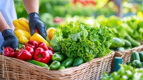 Fototapeta premium A vibrant display of fresh vegetables, including peppers, lettuce, and cucumbers, in woven baskets at a market, highlighting healthy eating and local produce, sustainable living lifestyle.