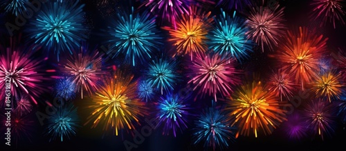 Fototapeta premium A vibrant display of multicolored starburst fireworks illuminating a black backdrop with ample space for written content