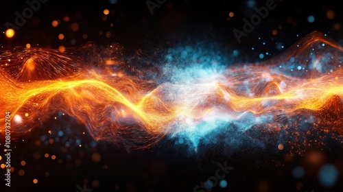 Obraz premium A vibrant display of orange and blue light waves with glowing particles on a dark background.