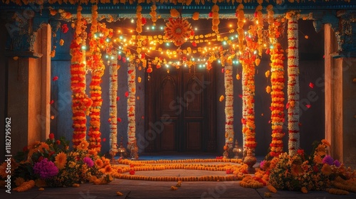 Obraz premium A vibrant display of traditional Janmashtami decorations, including garlands, torans, and lights, creating a joyful ambiance.