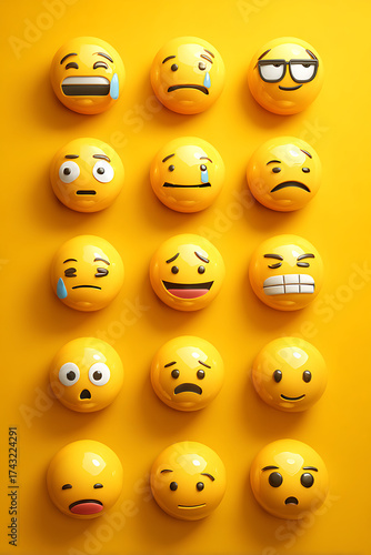 Fototapeta premium A vibrant display of various emoticon faces on a bright yellow background,...