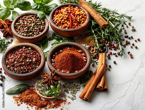 Fototapeta premium A vibrant display of various spices and herbs in bowls, showcasing culinary...