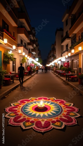 © val, Naklejka premium A vibrant Diwali scene featuring a beautifully crafted rangoli design illuminated by soft street lights, creating a festive atmosphere in an urban setting.