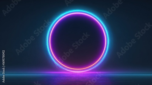 © Open, Obraz premium A vibrant, double neon ring, pink and cyan, glows intensely against a dark background, reflecting subtly on a low, smooth surface. The inner ring is slightly smaller than the outer one