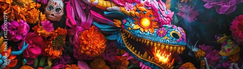 Fototapeta premium A vibrant dragon adorned with flowers and skulls, celebrating cultural traditions and artistry in a colorful, mystical setting.