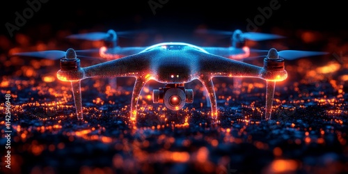 © Dmitry, Obraz premium A vibrant drone hovers over an illuminated landscape, showcasing futuristic technology