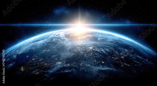Fototapeta premium A vibrant Earth from space, illuminated by the sun's rising brilliance....