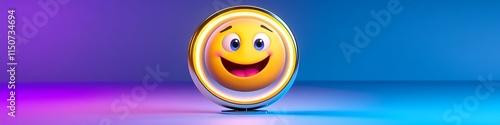 © Day of Happiness, Fototapeta premium A vibrant emoji mirror with a silly face design placed on a gradient backdrop of blues and purples