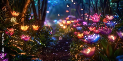 Obraz premium A vibrant, enchanting pathway through a magical forest filled with glowing flowers.