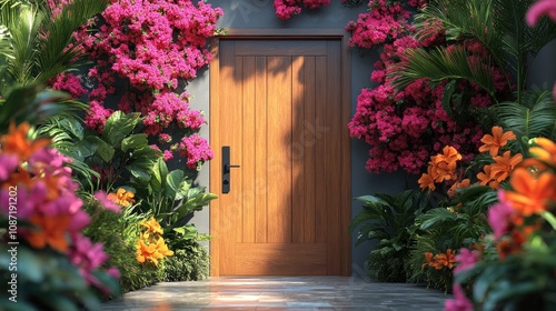 Naklejka premium A vibrant entrance adorned with colorful flowers and greenery.