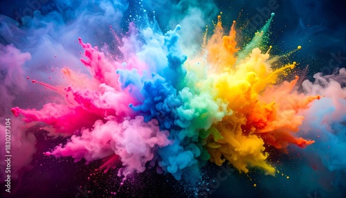 © Ysrclub, Obraz premium A vibrant explosion of colorful powder puffs outwards on a dark background