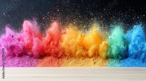 © jaki, Obraz premium A vibrant explosion of rainbow-colored powder erupts against a dark background, creating a dynamic and colorful display with a light wooden surface in the foreg