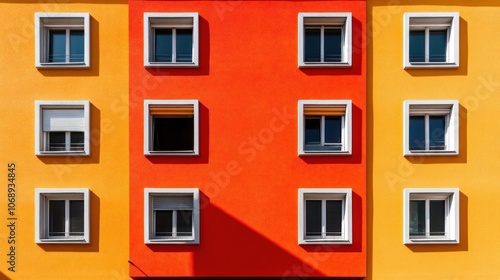 Fototapeta premium A vibrant facade featuring colorful walls and windows in a modern...