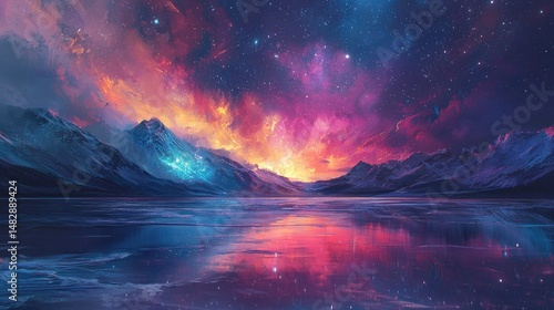 Fototapeta premium A vibrant, fantastical landscape of mountains, sky, and reflected colors.