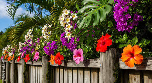 Fototapeta premium A vibrant fence adorned with colorful tropical flowers in full bloom,...