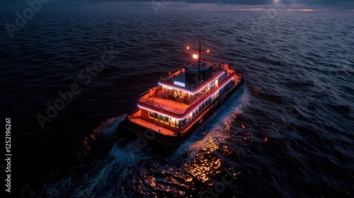 Naklejka premium A vibrant ferry gliding through dark waters at dusk, illuminated by colorful...