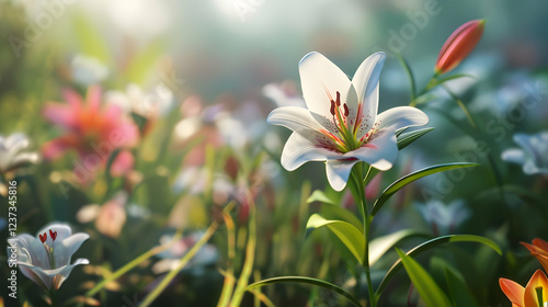 Fototapeta premium A vibrant field of lilies in soft sunlight, showcasing nature's beauty and...