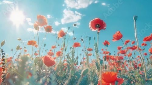 © peeter, Obraz premium A vibrant field of poppies under a bright blue sky.