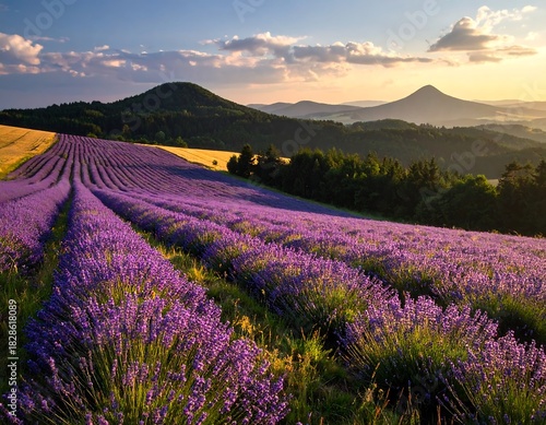 © Hambleng, Fototapeta premium A vibrant field of purple lavender blooms, stretching toward distant mountains. The warm sunrise bathes the scene in golden light