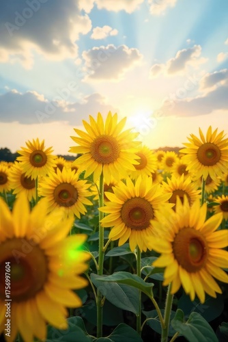 Naklejka premium A vibrant field of sunflowers basking in golden sunlight, conveying optimism and warmth The bright yellow blossoms stretch towards the sky, symbolizing hope and positivity , sky, joy