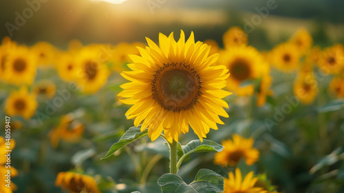 Fototapeta premium A vibrant field of sunflowers basking in the warm glow of a sunset, symbolizing summer and natural beauty.