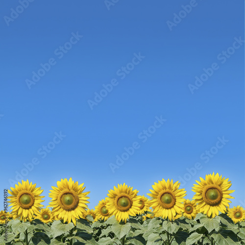 © Thanaphon, Fototapeta premium A vibrant field of sunflowers growing organically under clear blue sky, radiating warmth and joy.
