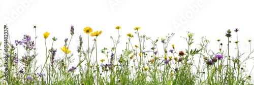 © Thunyarat, Fototapeta premium A vibrant field of wildflowers against a crisp white backdrop.