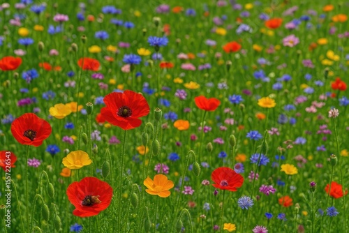 © TheWaterMeloonProjec, Fototapeta premium A vibrant field of wildflowers featuring bright poppies, ideal for pollinators