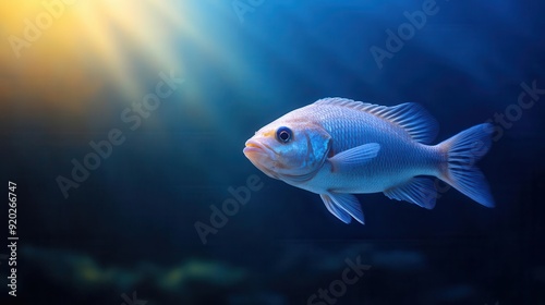 Fototapeta premium A vibrant fish swims gracefully in serene underwater light, highlighting its unique colors and features in a tranquil aquatic setting.