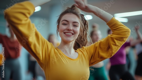© Olsek, Obraz premium A vibrant fitness class atmosphere filled with energy. A young woman dances joyfully in the foreground. Movement and rhythm inspire creativity. Generative AI
