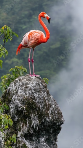 Fototapeta premium A vibrant flamingo perched on a rocky outcrop amidst a misty, lush green...