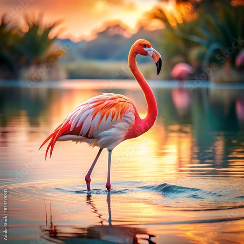 Fototapeta premium A vibrant flamingo stands gracefully in tranquil waters against a stunning...