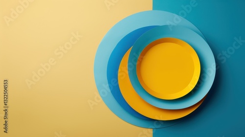 © ChimE, Obraz premium A vibrant flat lay composition featuring abstract color papers in light blue and yellow tones, perfect for creative projects.