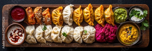 © AI Photo Stock, Fototapeta premium A Vibrant Flat-Lay of Assorted Momos and Dips - A colorful assortment of steamed momos, served with a variety of flavorful dipping sauces. Represents culinary diversity, vibrant flavors