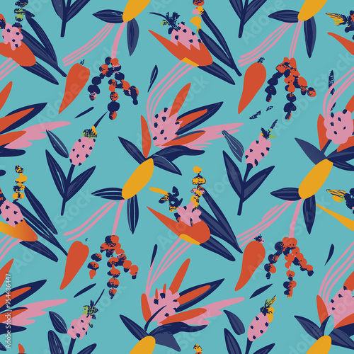 Fototapeta premium A vibrant floral pattern featuring abstract shapes and colors on a light blue...