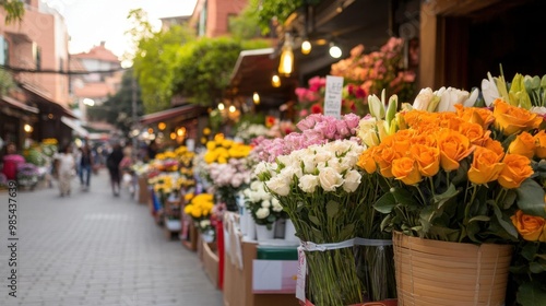 Fototapeta premium A vibrant flower market bustling with colorful blooms, showcasing roses,...