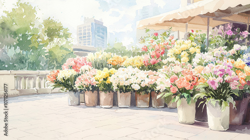 © SJ Studio, Fototapeta premium A vibrant flower market featuring colorful blooms in pots, set against a sunny backdrop with greenery and buildings in the distance.
