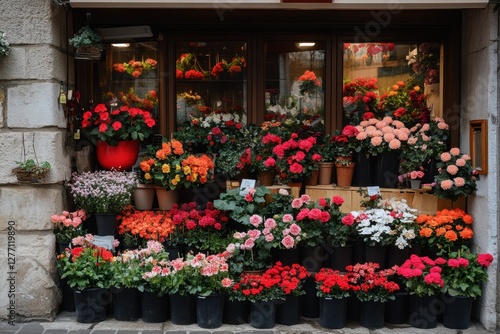 Fototapeta premium A vibrant flower shop filled with a variety of colorful flowers, showcasing diverse species, sizes, and arrangements for every occasion.