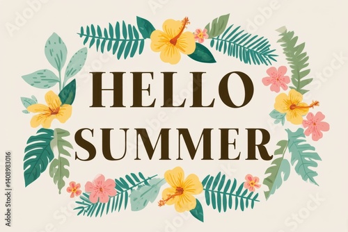 © DSimage, Obraz premium A vibrant flower wreath featuring the cheerful greeting Hello Summer, Hello Summer background.