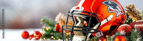 © WACHI, Fototapeta premium A vibrant football helmet amidst festive decorations, symbolizing the spirit of sports and holiday cheer.