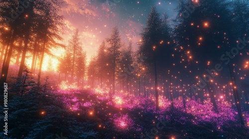 Fototapeta premium A vibrant forest awakening at dawn with colorful flowers blooming under...