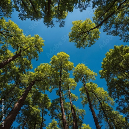 Fototapeta premium A vibrant forest canopy under a bright blue sky.
