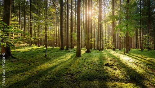Obraz premium a vibrant forest scene with sunlight filtering through tall trees casting...